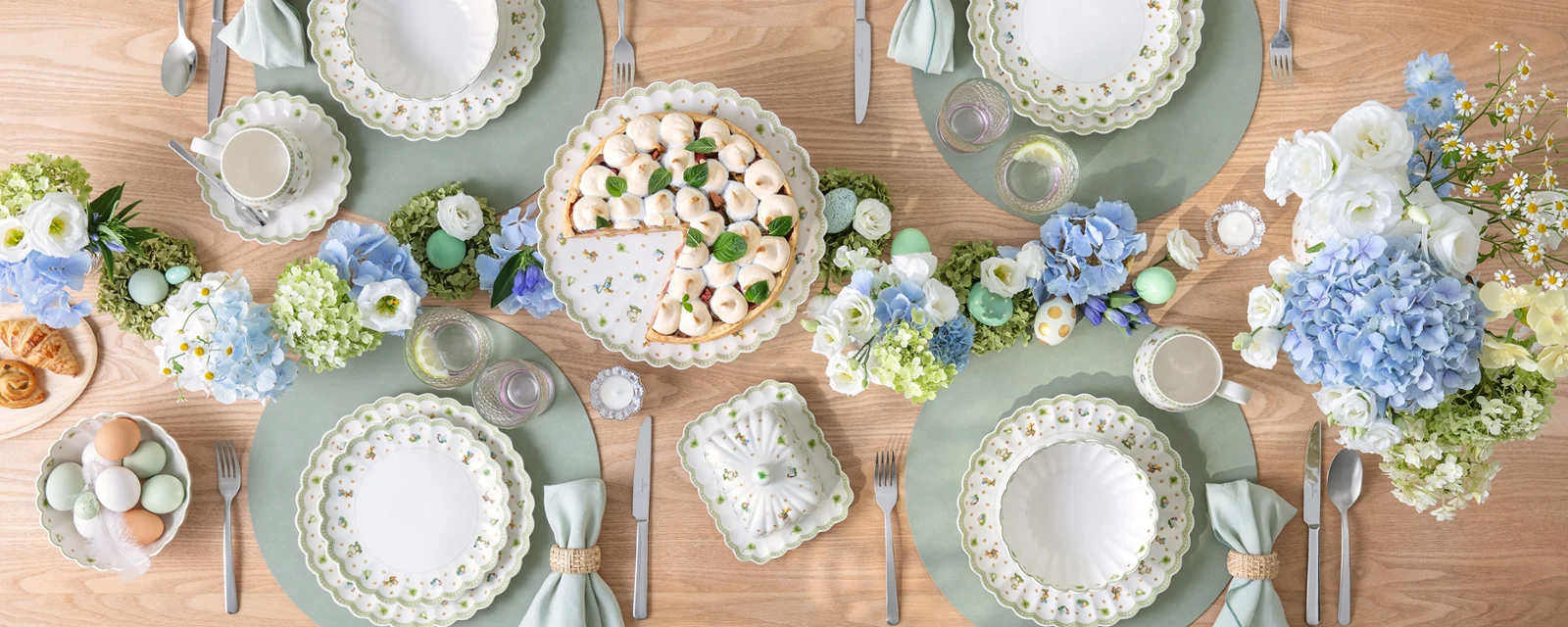 The Easter Delight collection is perfect for classic Easter tables, as it combines the magic of childhood with lovingly illustrated toy classics from the Erzgebirge region and delicate harbingers of spring such as clover and snowdrops. Small golden Easter eggs add sparkling accents and lend the decor a playful elegance that radiates comfort and festivity at the same time. For a well-rounded classic Easter table, we recommend complementing the collection with Fleur tealight holders, Boston glasses, Like cutlery, and fabric napkins in mint green.